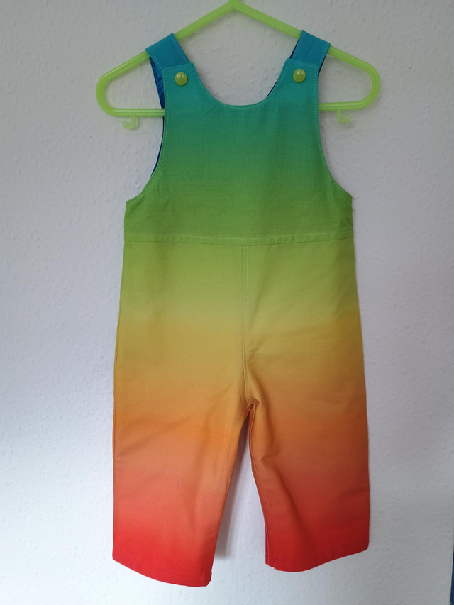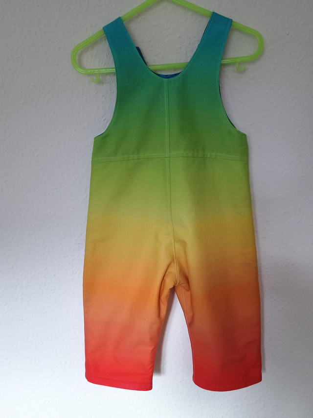 The multicoloured fabric blends from red at the hem through orange, mustard and pale green to turquoise at the top. The bodice is lined with royal blue cotton batik fabric with a design of lighter blue fish and the legs are lined with cream cotton lycra. The dungarees have poppers on the straps - an extra set leave room for growth, as do the turn-ups on the legs. Maximum length is 43 cm back neck to crotch and 61 cm back neck to hem.